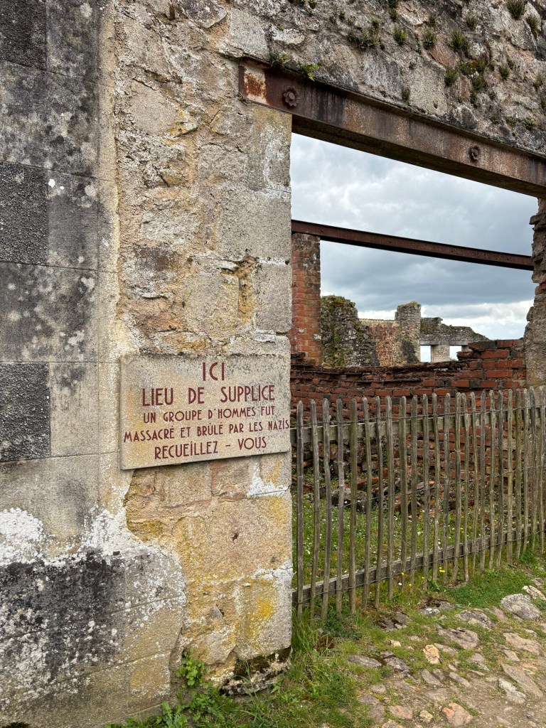 Over 600 civilians including 200 children were killed by the Nazis in 1944. They have left the ruined village as a memorial and have labelled the buildings with the names of the former owners and their occupations.